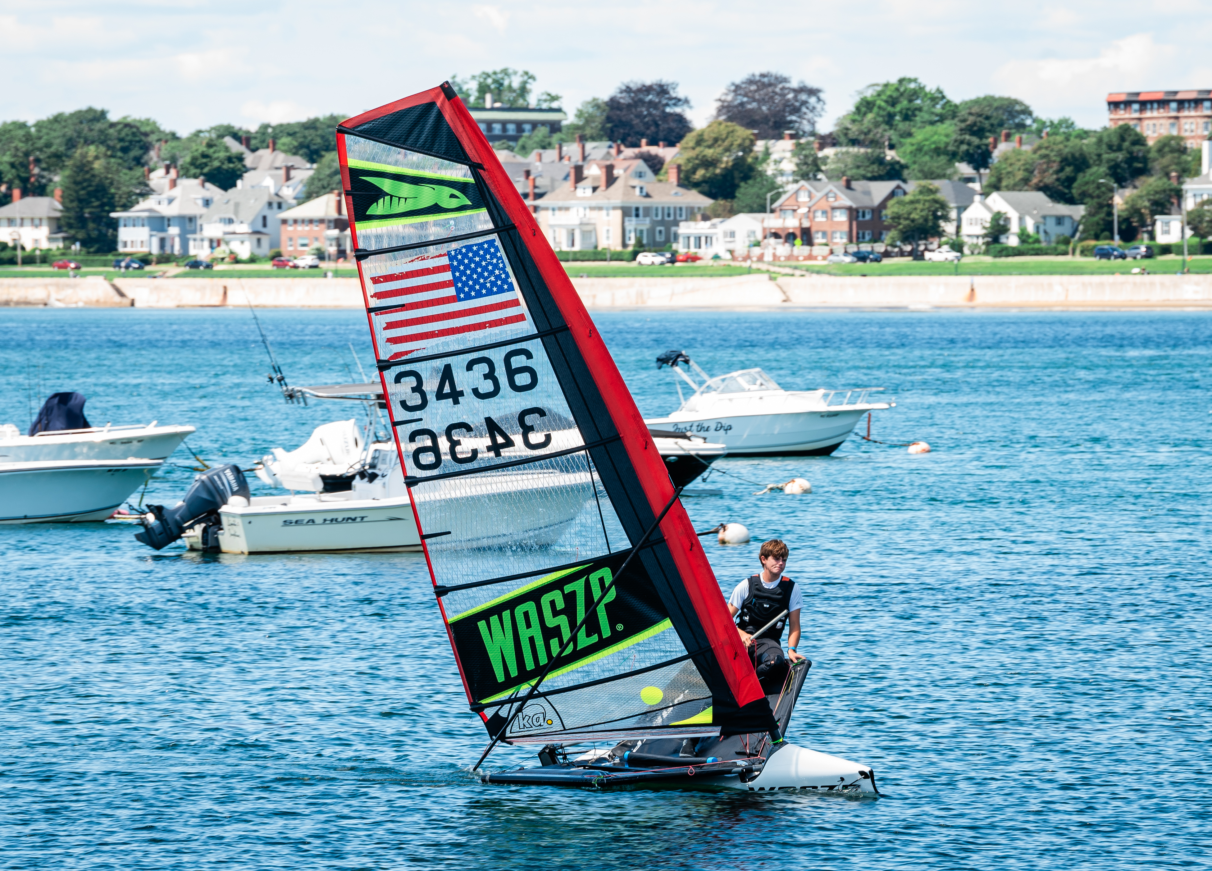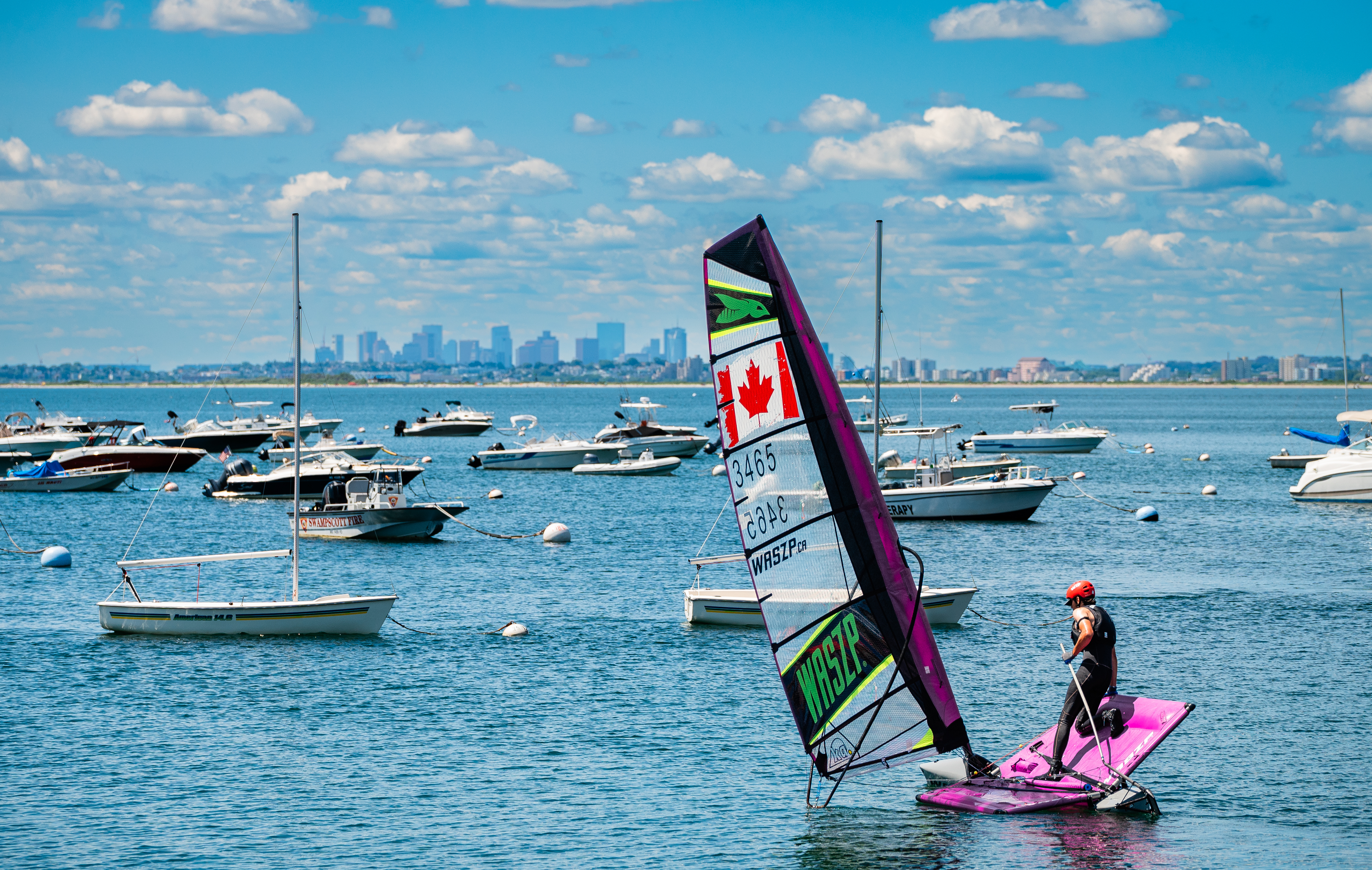Andi Kinner, of Halifax, Nova Scotia, sails his WASZP into Nahant Bay to take part in a training session during the 2023 WASZP North American Championship Regatta.