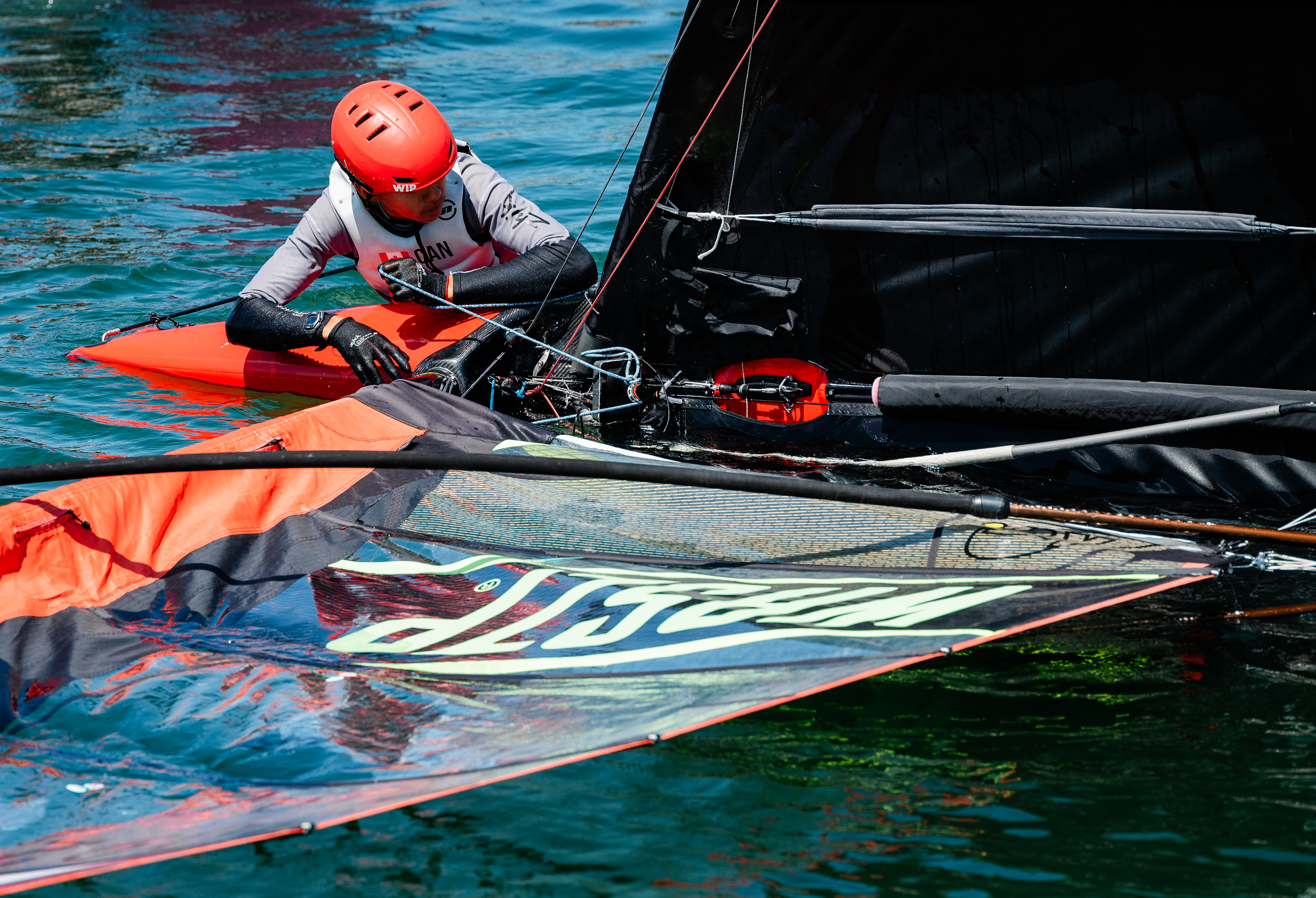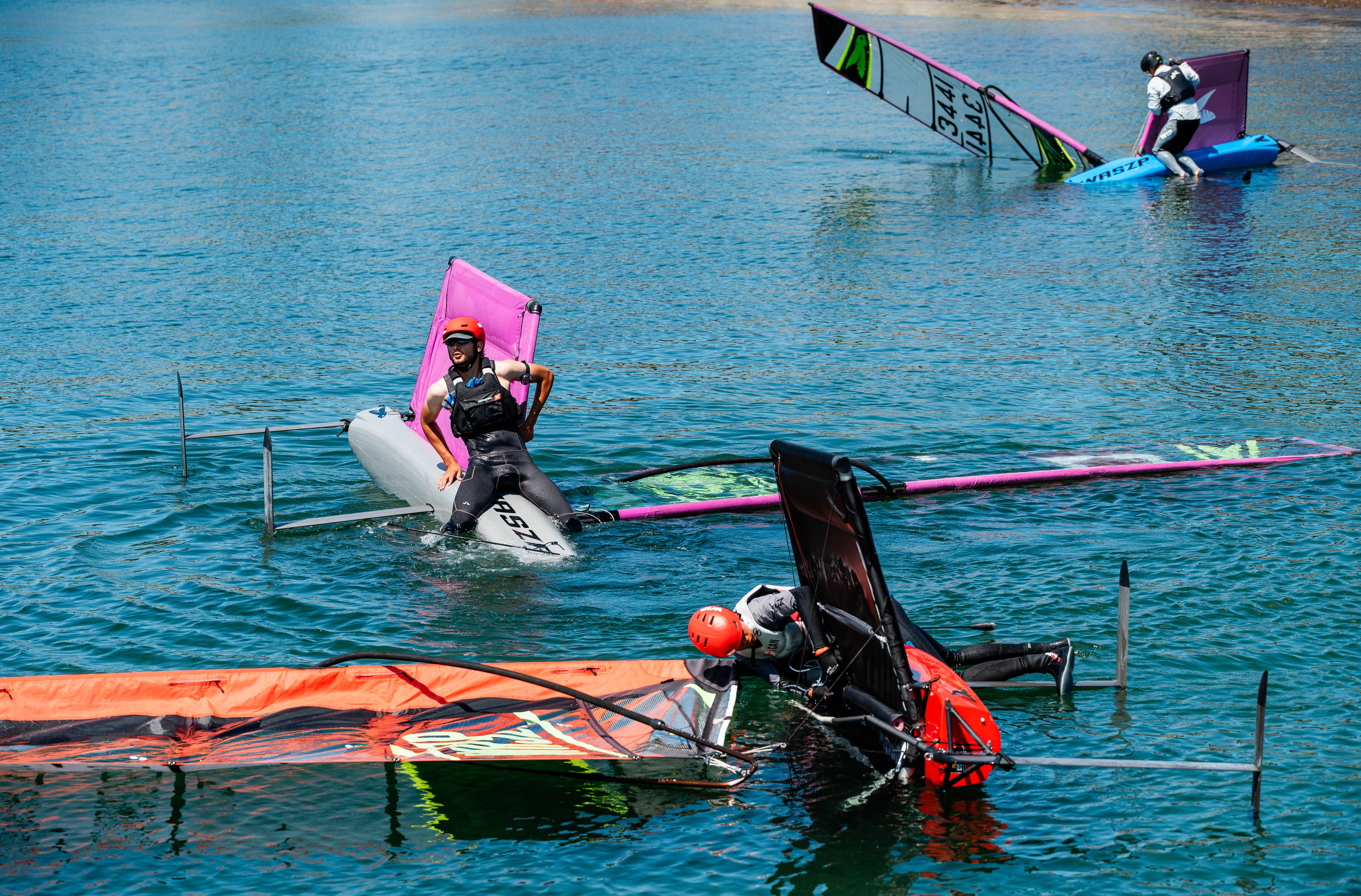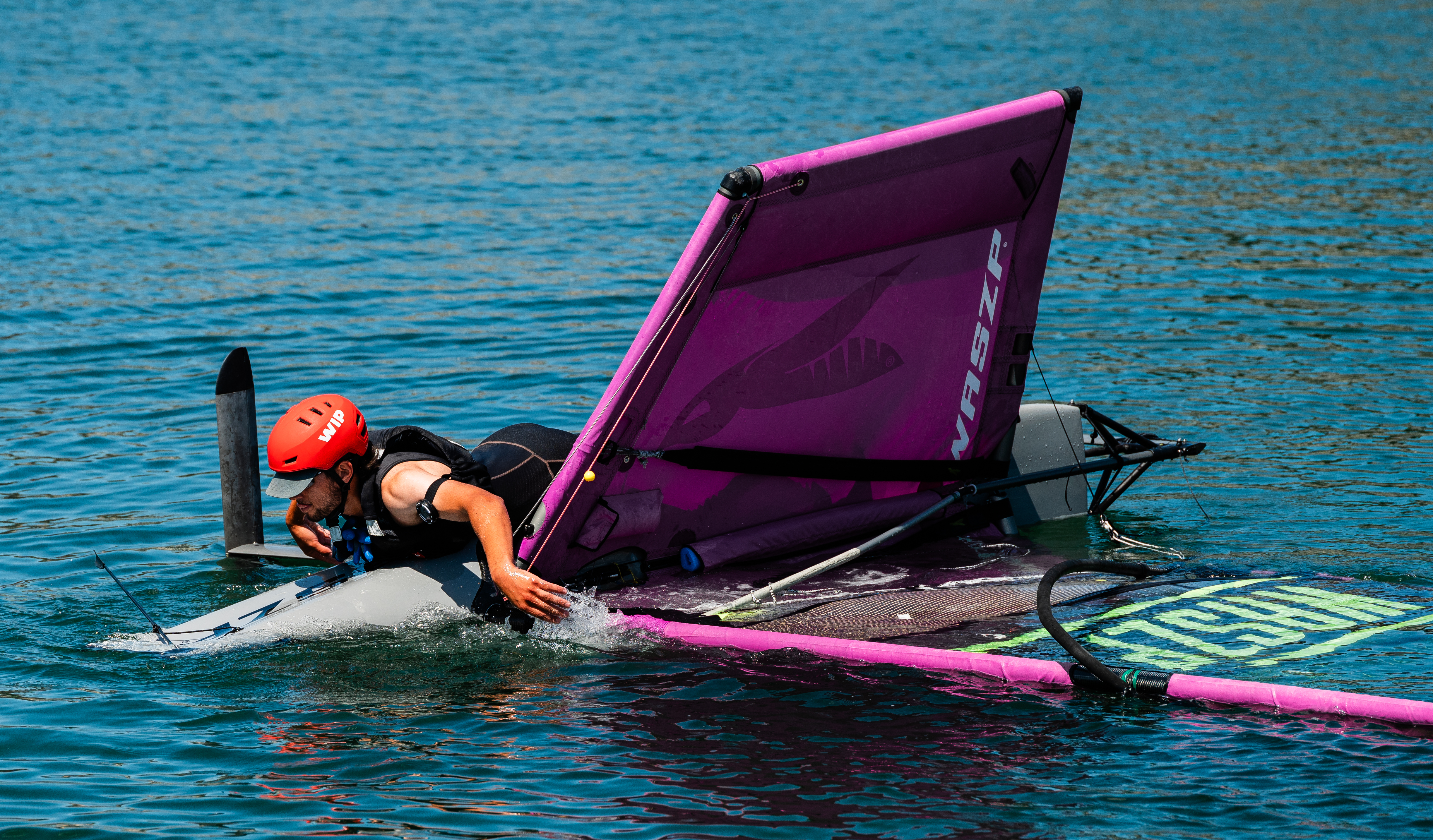 Andi Kinner, of Halifax, Nova Scotia, flips his WASZP right-side-up as he heads out into Nahant Bay to take part in a training session during the 2023 WASZP North American Championship Regatta.